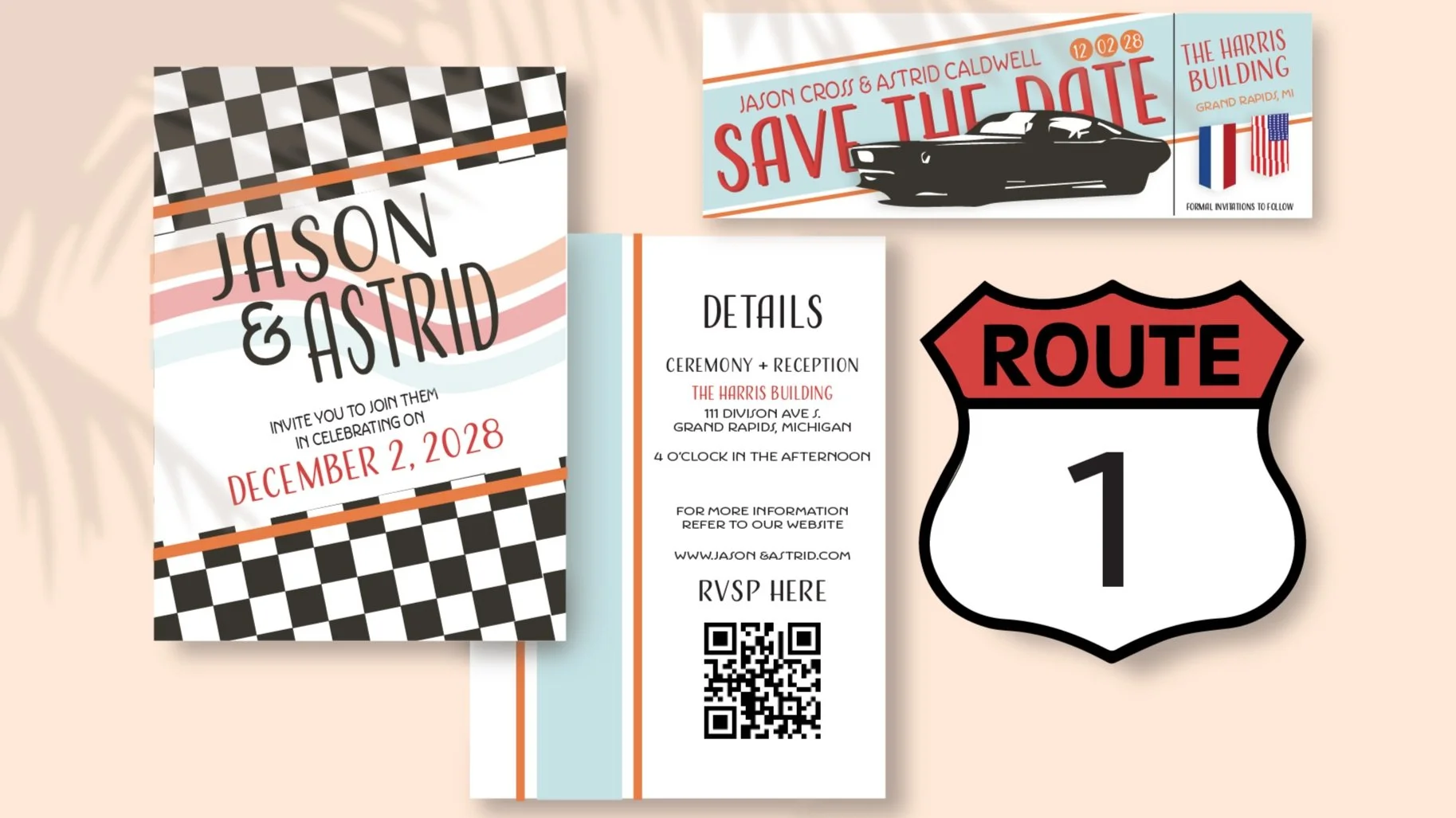 Originally designed as a custom concept for a real wedding, Route to Forever captures the energy of a vintage American road trip and the sentiment of love that goes the distance. With checkerboard prints, retro red-orange-teal linework, and a save the date shaped like a race track ticket, this suite embraces nostalgic Americana with playful flair. A hand-drawn 1969 Mustang anchors the design, while hanging U.S. and Dutch flags symbolize a cross-cultural journey. A Route 66-style sign for table numbers ties the theme together with classic diner charm. Bold, a little kitschy, and full of heart—this suite proves the best roads lead to forever.
