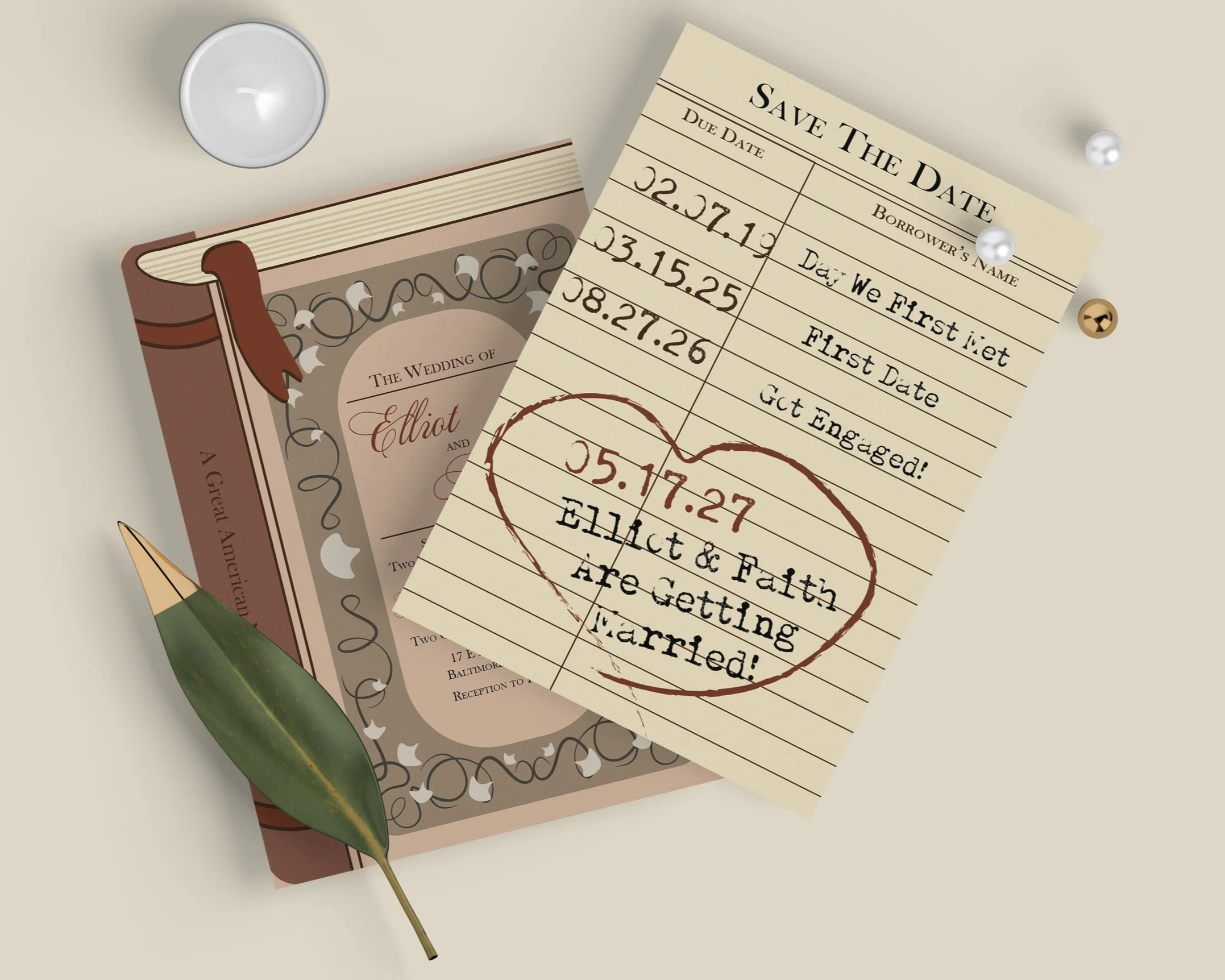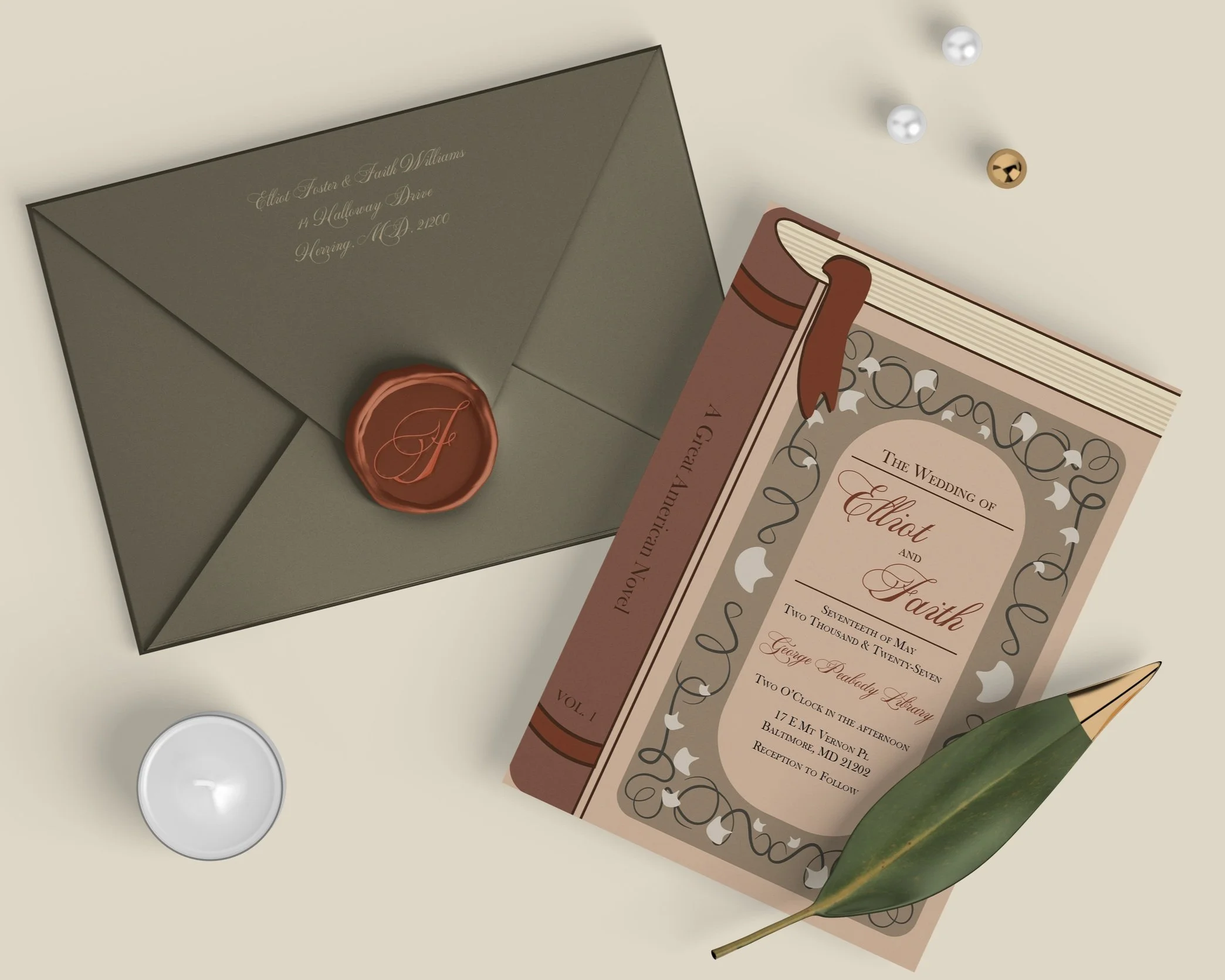 This wedding invitation suite draws inspiration from Elizabeth Gerardi’s “Great American Novel,” blending nostalgia, romance, and storytelling into a cohesive literary theme. The set includes a library card-style save the date, a book cover-inspired wedding invitation, and a coordinating envelope sealed with a custom wax stamp. A warm, earthy palette—featuring deep green, soft sage, tan, and rusty browns—evokes the feeling of late-afternoon light on old paper and leather-bound love stories. Designed to feel timeless and personal, this suite is perfect for couples who see their love as something worth writing home about.